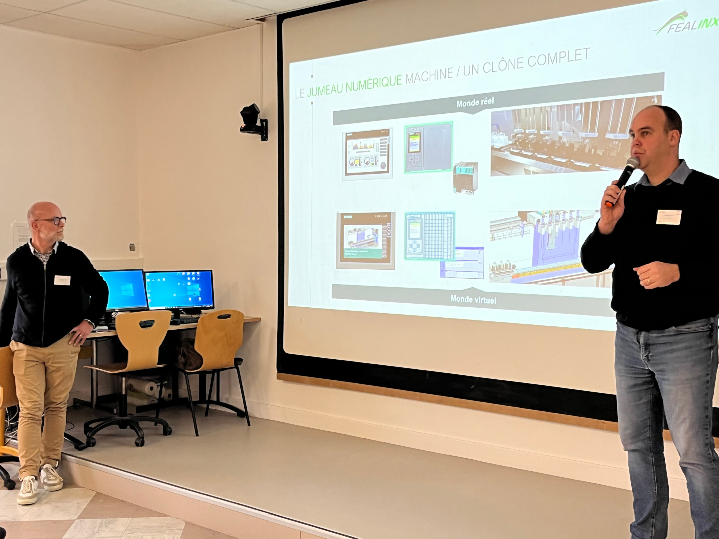Les moments forts de la journée ont inclus des présentations et des démonstrations sur les concepts passionnants du jumeau numérique et de la maintenance prédictive. M. VALBOUSQUET de la société 4CAD a captivé l’audience en abordant l’optimisation des performances d’un système de production existant et l’anticipation des défis organisationnels grâce à l’utilisation d’un jumeau numérique. M. LANGUEREAU de la société TECH OUEST PRESTATION et M. DUJARDIN de FEALINX ont ensuite approfondi le sujet en se concentrant sur le jumeau numérique appliqué à la « machine de production ». Leur exposé a mis en lumière les multiples avantages offerts par le jumeau numérique tout au long du cycle de développement d’une machine, tant du côté du concepteur que de l’utilisateur final.